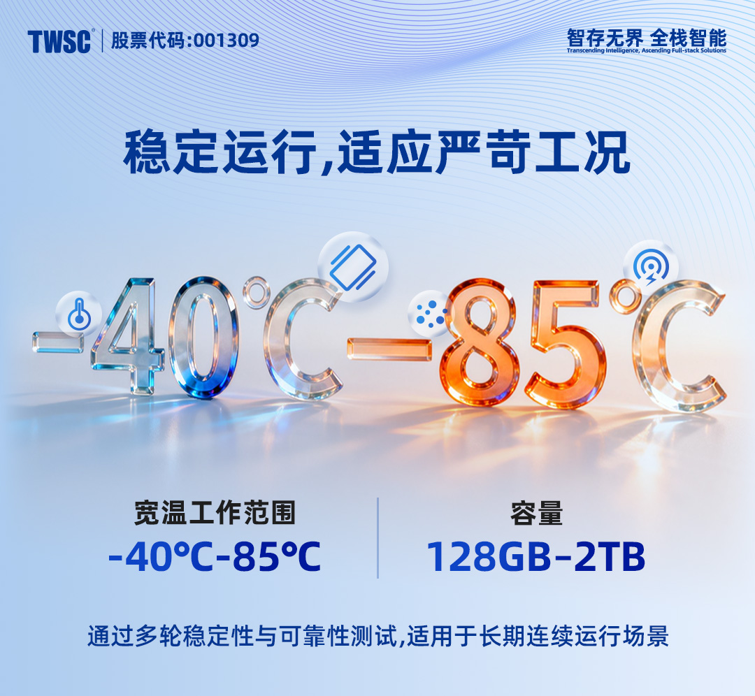 德明利DS1420系列宽温方案面向工业场景高强度、长周期作业需求,在确保供应链安全与长期稳定交付的同时,为关键基础设施与工业系统,提供可靠的国产存储选择。
